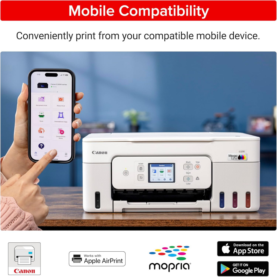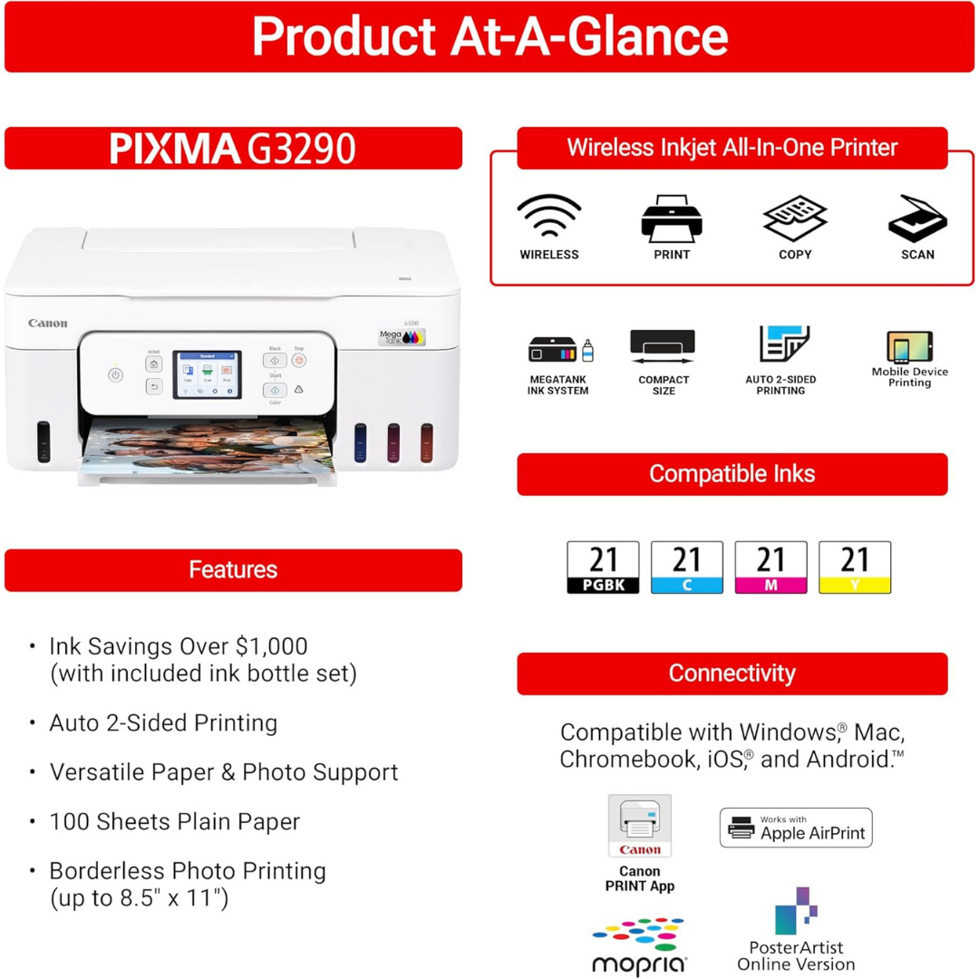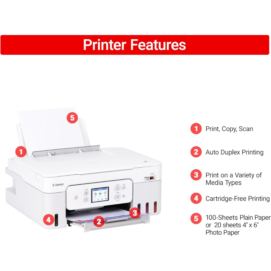 Experience exceptional printing performance with the Canon Megatank G3290 All-in-One Wireless Supertank Printer. This innovative printing solution features refillable ink tanks that deliver outstanding value and convenience for your home or office needs.